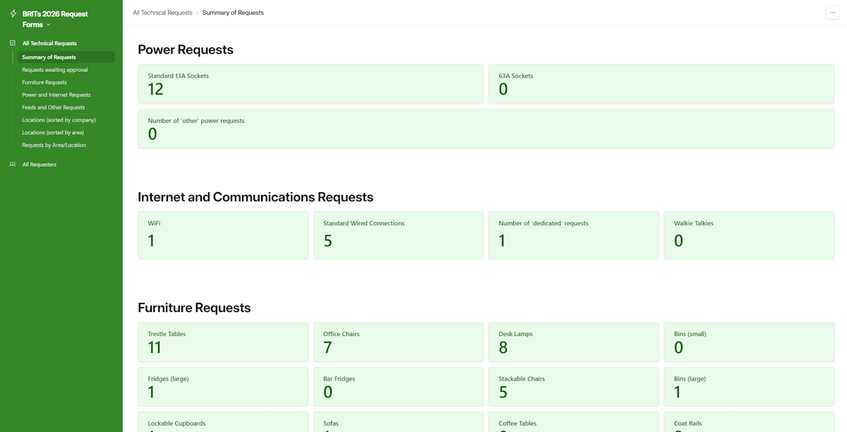 The All Technical Requests menu option contains a range of sub-options allowing you to view requests in different ways. For example, the there are options taking you to views limited to the specific types of request shown (Power and Internet/Furniture/Feeds and Other).