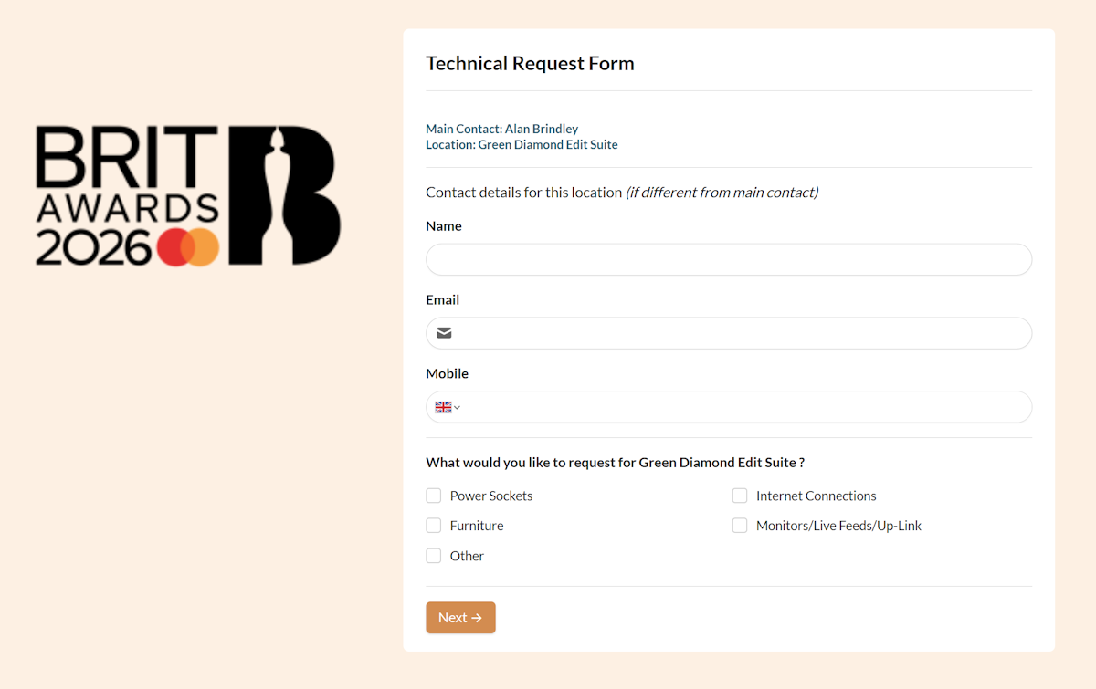 This page allows power requirements to be described, including the number of 13A and 63A sockets needed, as well as a general description of any other power requirements. |